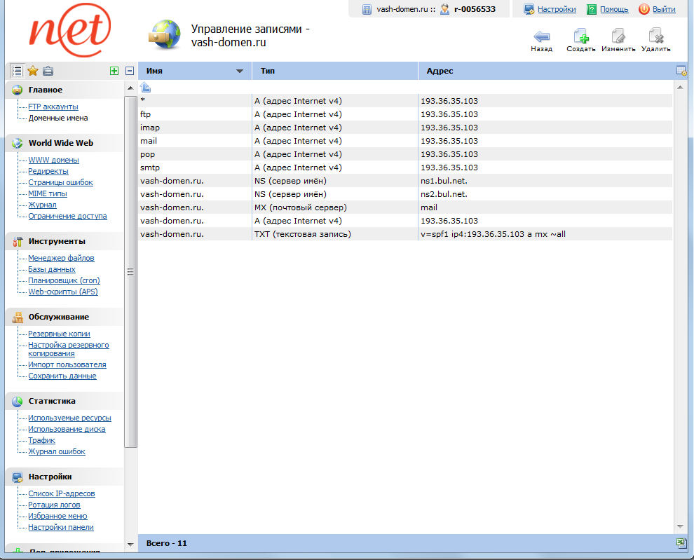 ISPManager -> Раздел Главное -> подраздел Доменные имена ::: иконка Записи